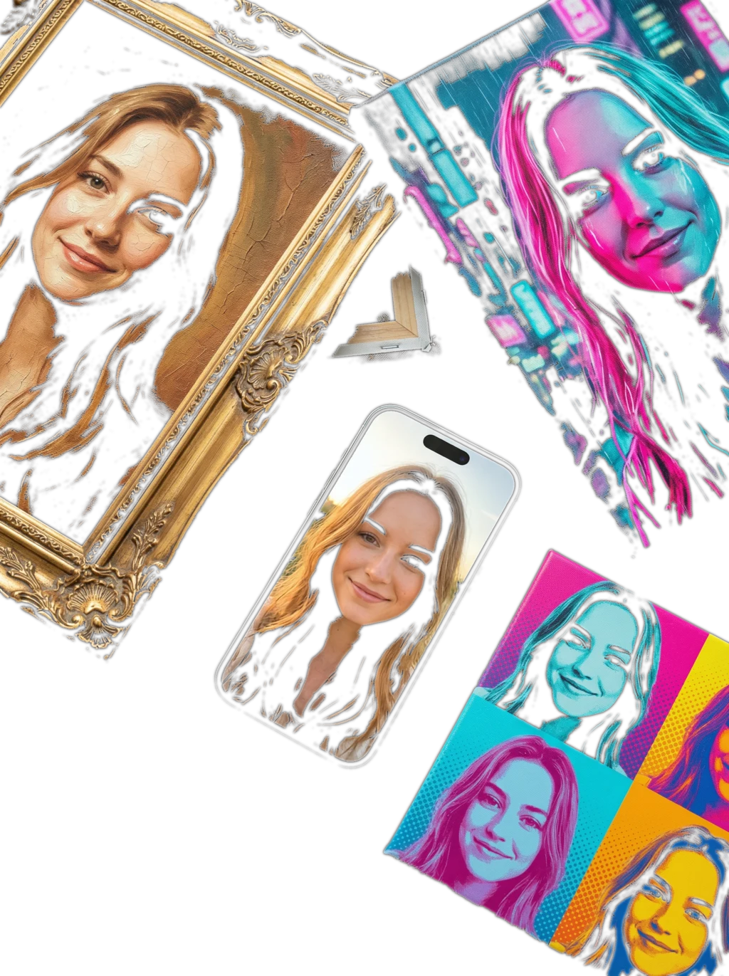 Upload any photo. Choose from Renaissance oil paintings, Warhol pop art, cyberpunk neon, and 11 more styles. We print it on premium canvas and ship it to your door — art ready in minutes, delivered in days.